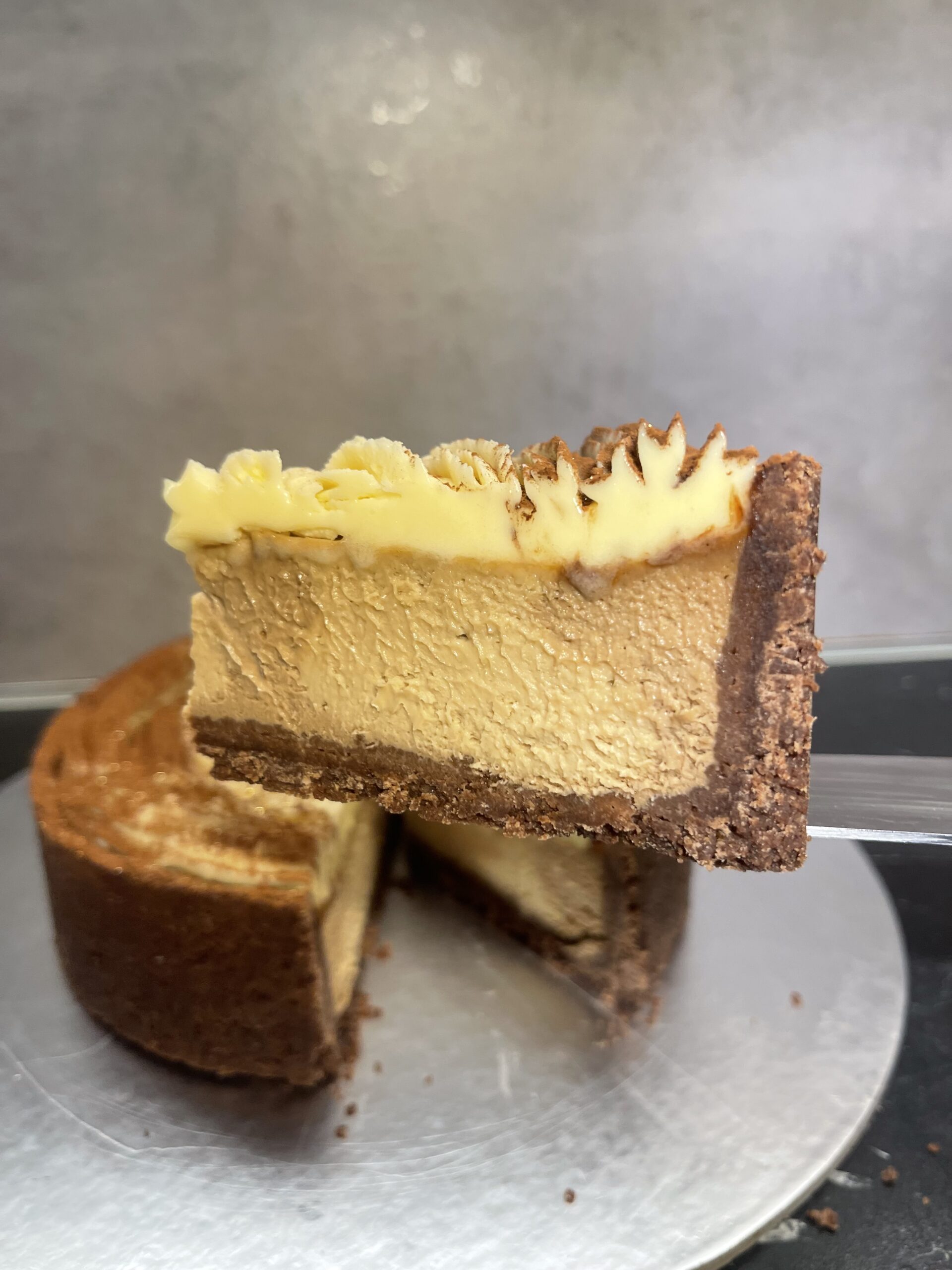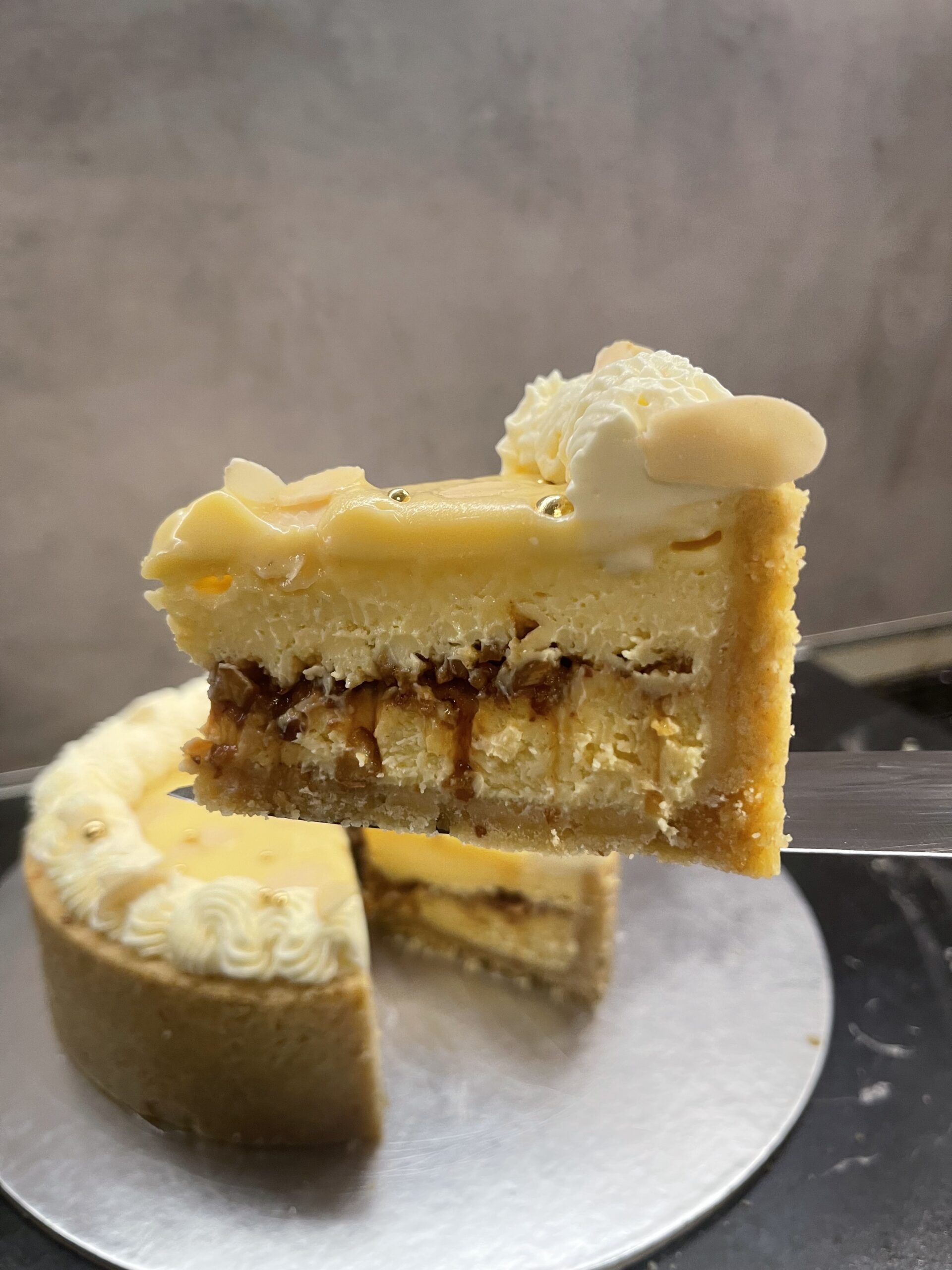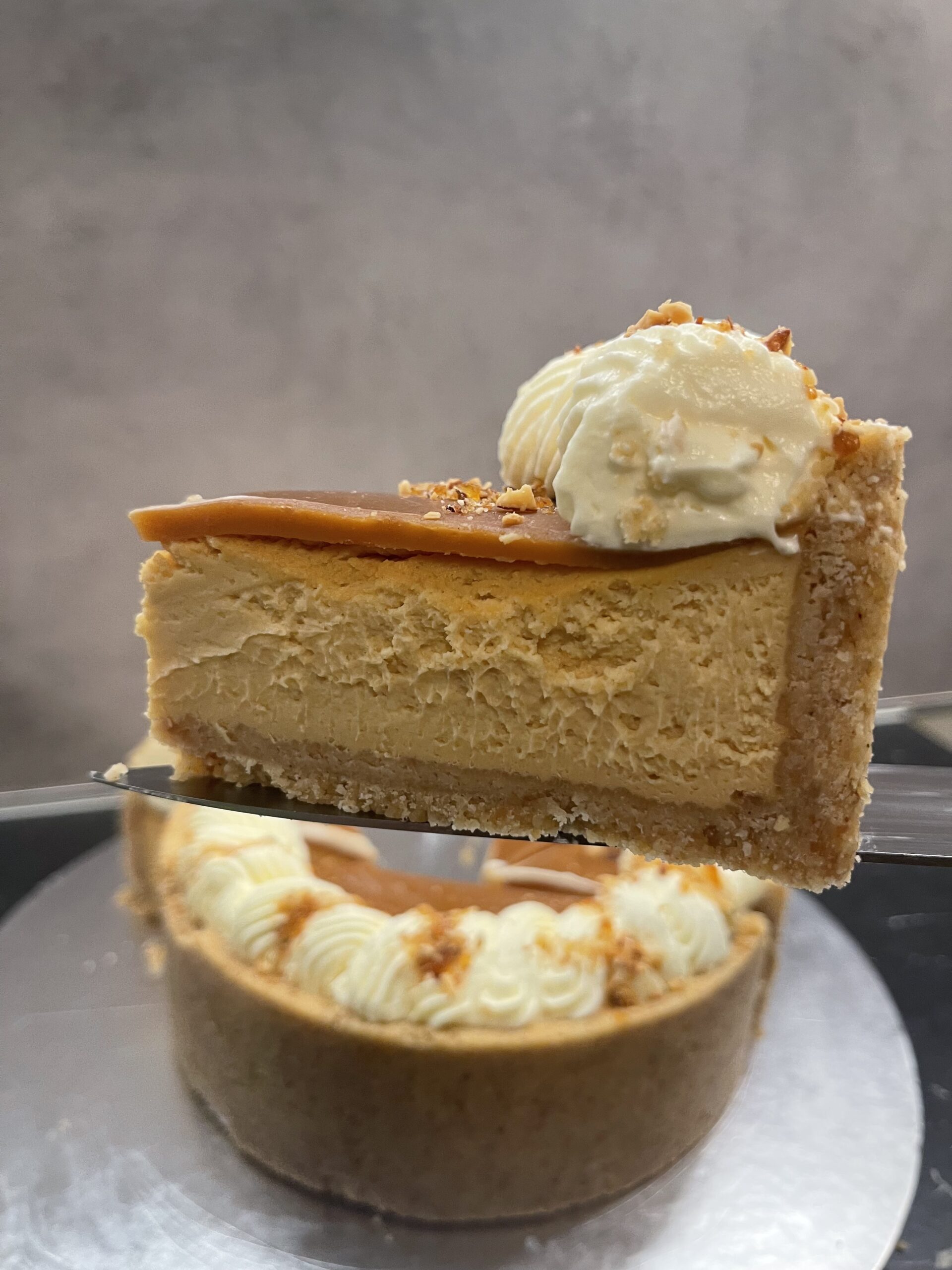 En sprø sablebunn som møter fyldig, silkemykt karamellfyll, toppet med et gyllent karamell-lokk. Hver bit er en balansert kombinasjon av rik sødme og elegant kremet tekstur — en ostekake for ekte karamellelskere.