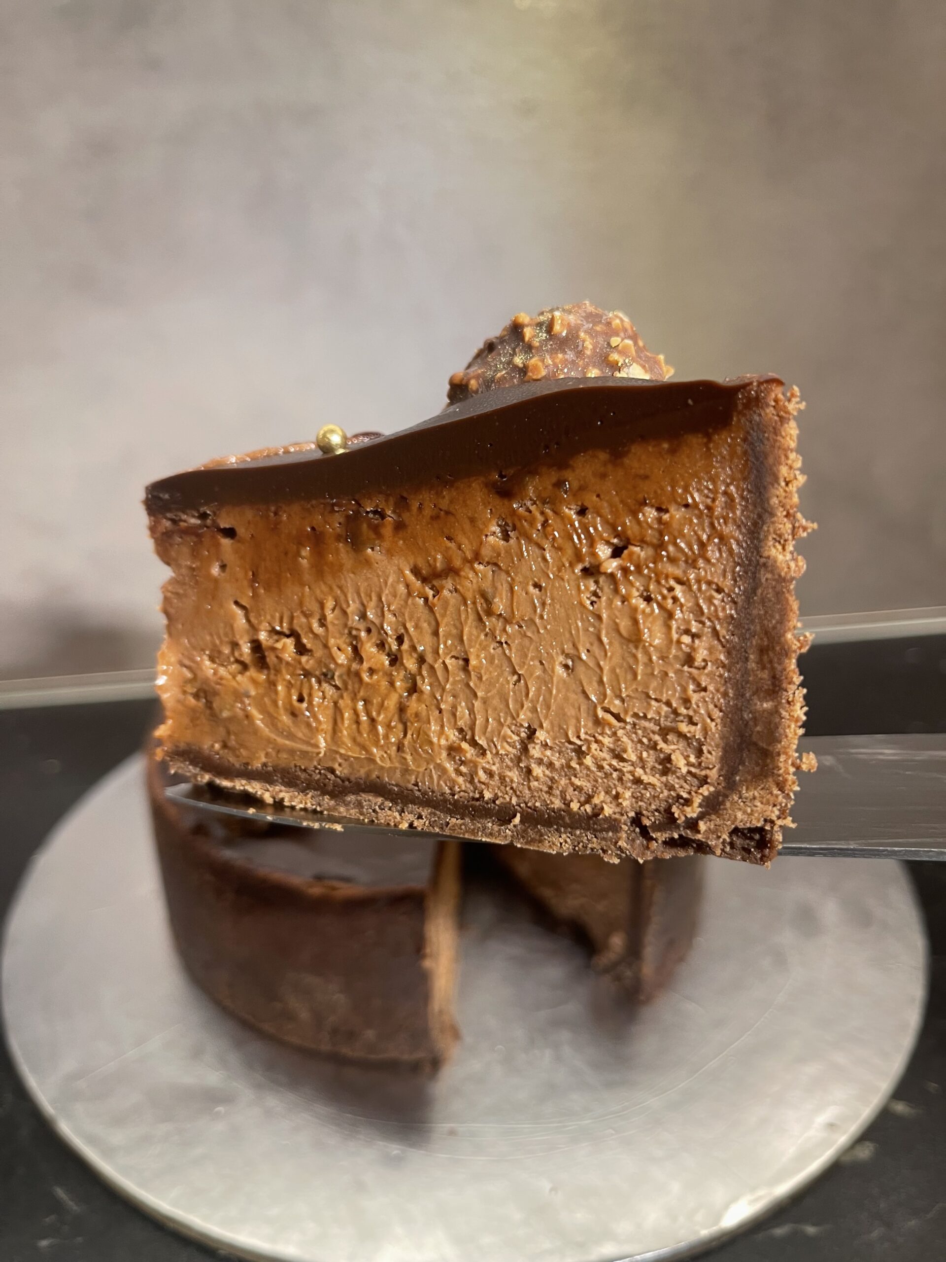 Med en sprø sjokoladesablebunn, fyldig sjokolade-hasselnøttfyll og et hint av hasselnøttpraliné, er dette en ostekake som kombinerer rik smak med elegant tekstur. Perfekt for de som elsker intense, luksuriøse smaksopplevelser.