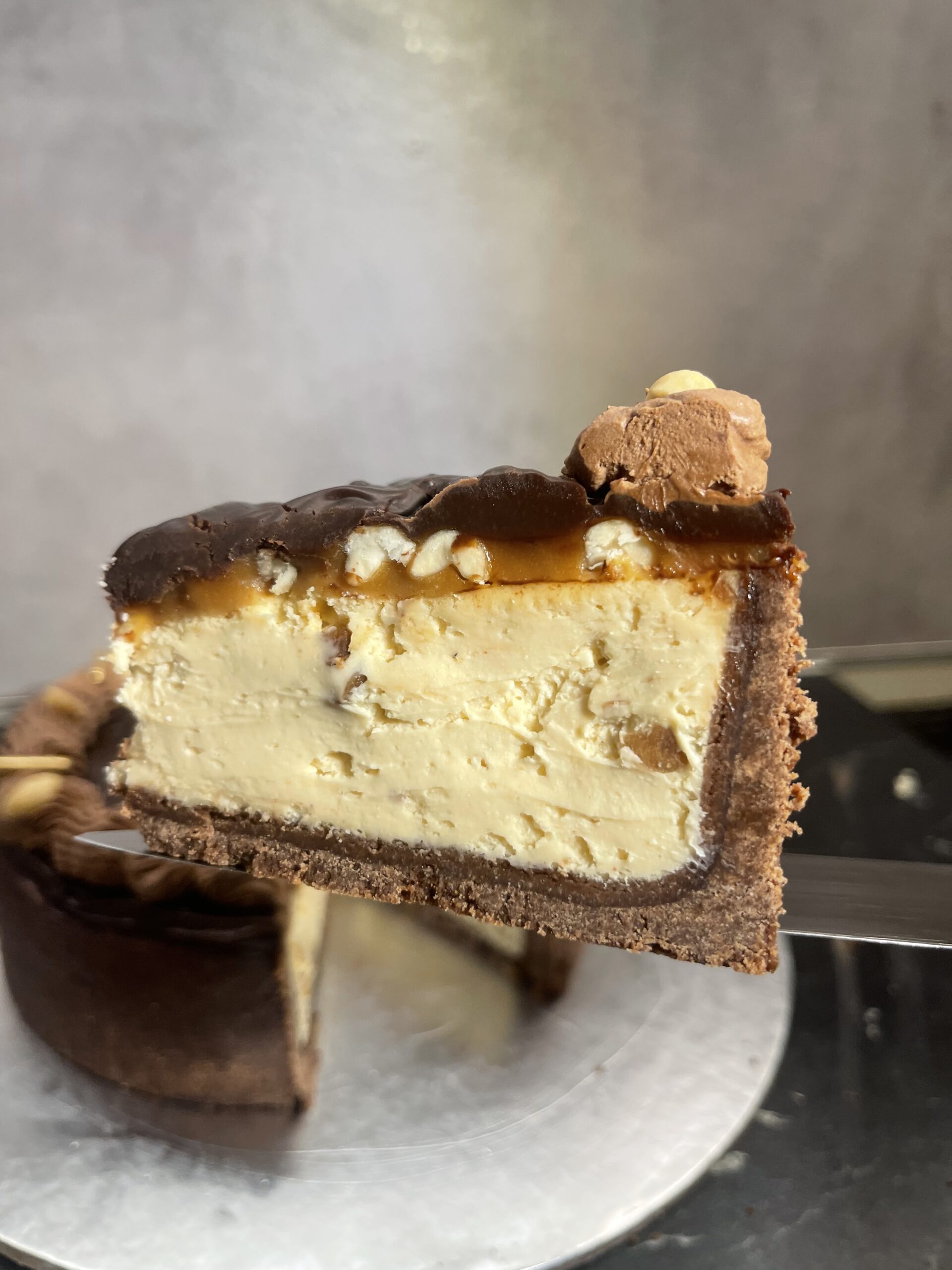 Med en sprø sjokoladesablebunn, kremet peanøttsmørfyll, toppet med gyllen karamell og crunchy peanøtter, og avsluttet med et sjokolade-lokk. En luksuriøs ostekake for alle som elsker kombinasjonen av sjokolade, karamell og nøtter.