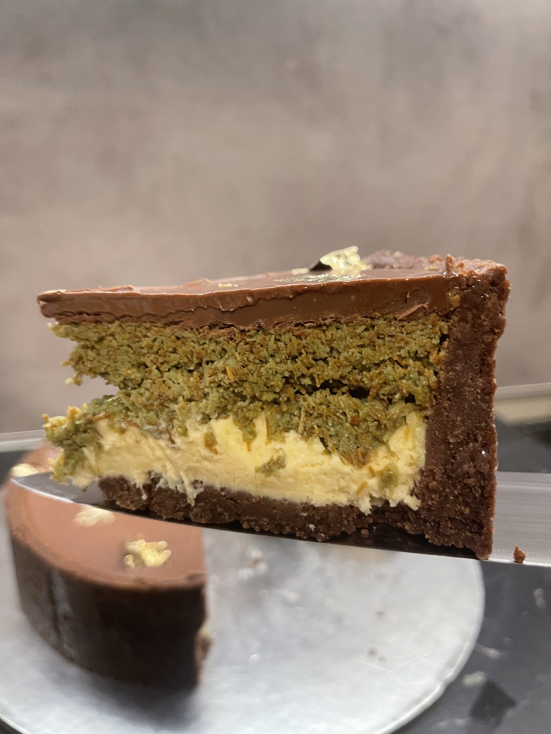 Med en sprø sjokoladesablebunn, fyldig hvit sjokoladefyll, et tykt lag av kundaif med pistasjenøtter, og toppet med et delikat sjokolade-lokk. En eksklusiv ostekake inspirert av luksus og rike smaker.